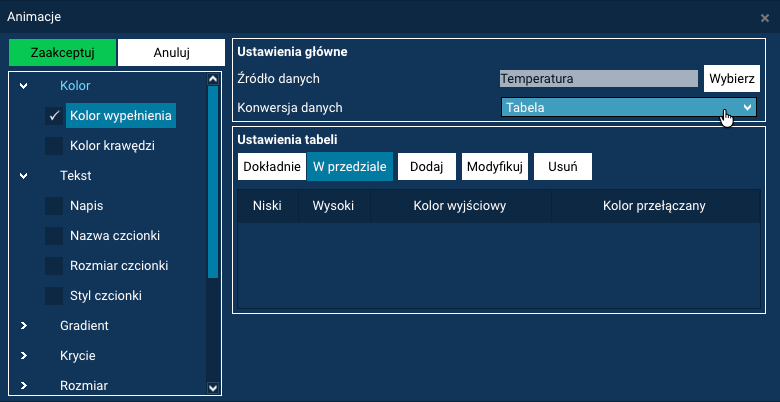 W przypadku animacji płynnej (tryb Zakres) należy zdefiniować zakres wartości wejściowych oraz odpowiadające im wartości wyjściowe, pomiędzy którymi zmiana będzie przebiegać liniowo.