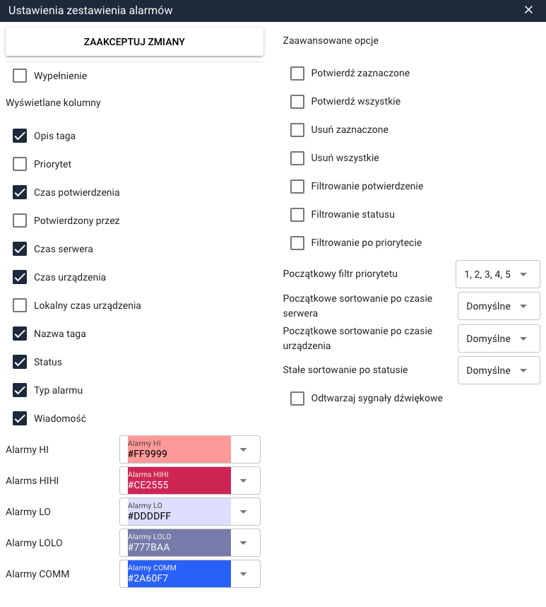 Otworzy si臋 okno Ustawienia zestawienia alarm贸w, w kt贸rym dost臋pne s膮 wszystkie opcje konfiguracyjne dotycz膮ce wygl膮du, filtrowania oraz obs艂ugi alarm贸w.