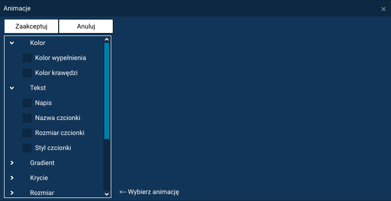 - Po wskazaniu wybranej właściwości animacji (zaznacz checkbox), po prawej stronie pojawią się właściwości konfiguracyjne.
