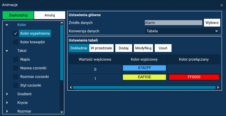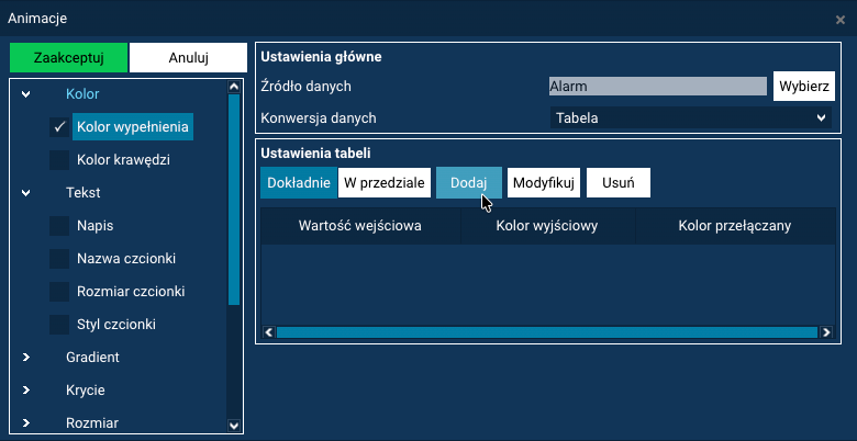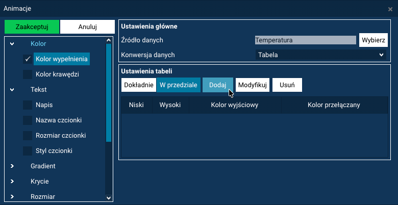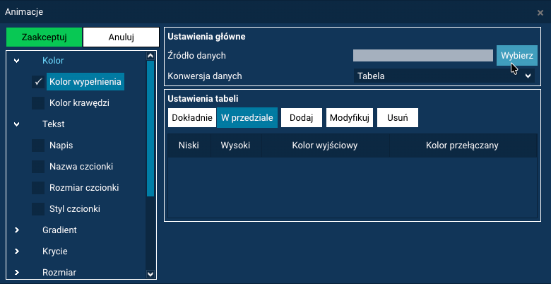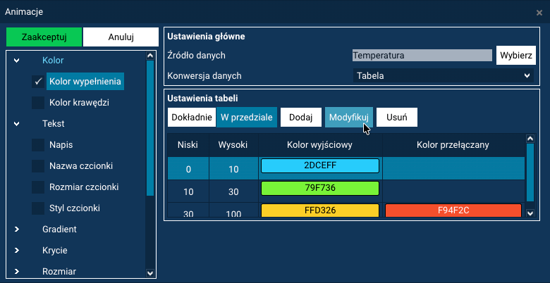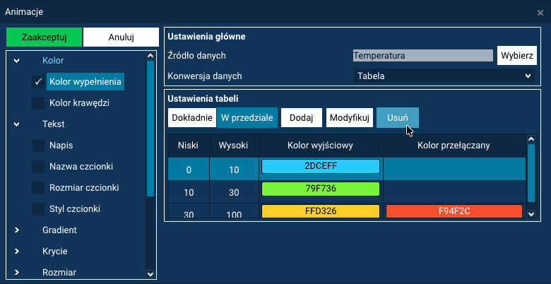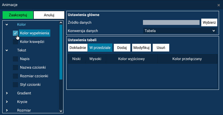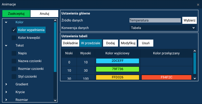 W przypadku animacji płynnej (tryb Zakres) należy zdefiniować zakres wartości wejściowych oraz odpowiadające im wartości wyjściowe, pomiędzy którymi zmiana będzie przebiegać liniowo.