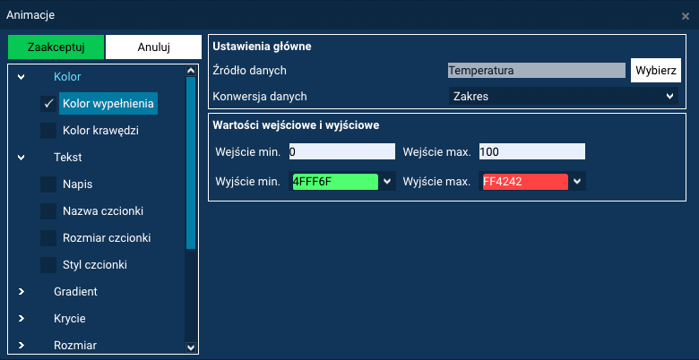Poniżej, jako przykład, przedstawiono krok po kroku proces konfiguracji koloru wypełnienia obiektu, który zmienia się płynnie w zależności od wartości temperatury zwracanej przez tag Temperatura.