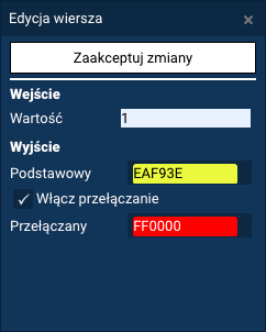 Można dodać wiele wierszy w tabeli – każda wartość wejściowa ma przypisany własny kolor (stały lub przełączany). Aby utworzyć nowy wpis, ponownie kliknij przycisk Dodaj.