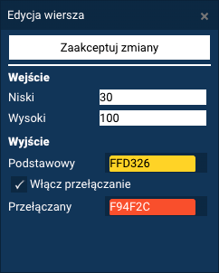 - Dla zmian płynnych wybierz zakres wartości wejściowych i wyjściowych. Dla zmian skokowych możesz wskazać wiele przedziałów, które będą zapisane w tabeli.