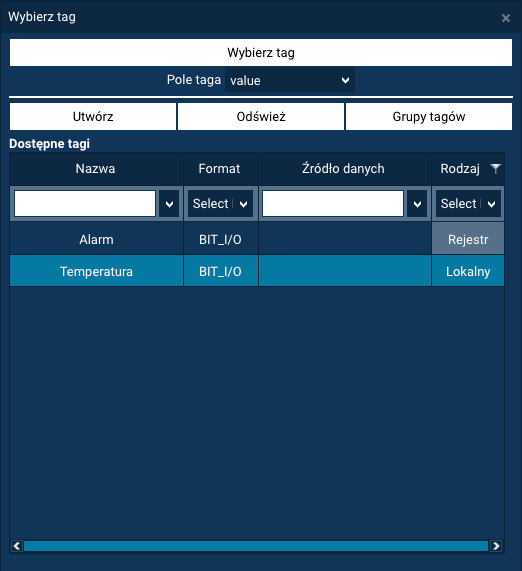 W wyświetlonym oknie wskaż odpowiedni tag sterujący animacją, a następnie wybierz Pole taga, które ma być wykorzystane do sterowania. W naszym przykładzie tagiem tym jest Temperatura (zostawiamy domyślną opcję pole taga value.)