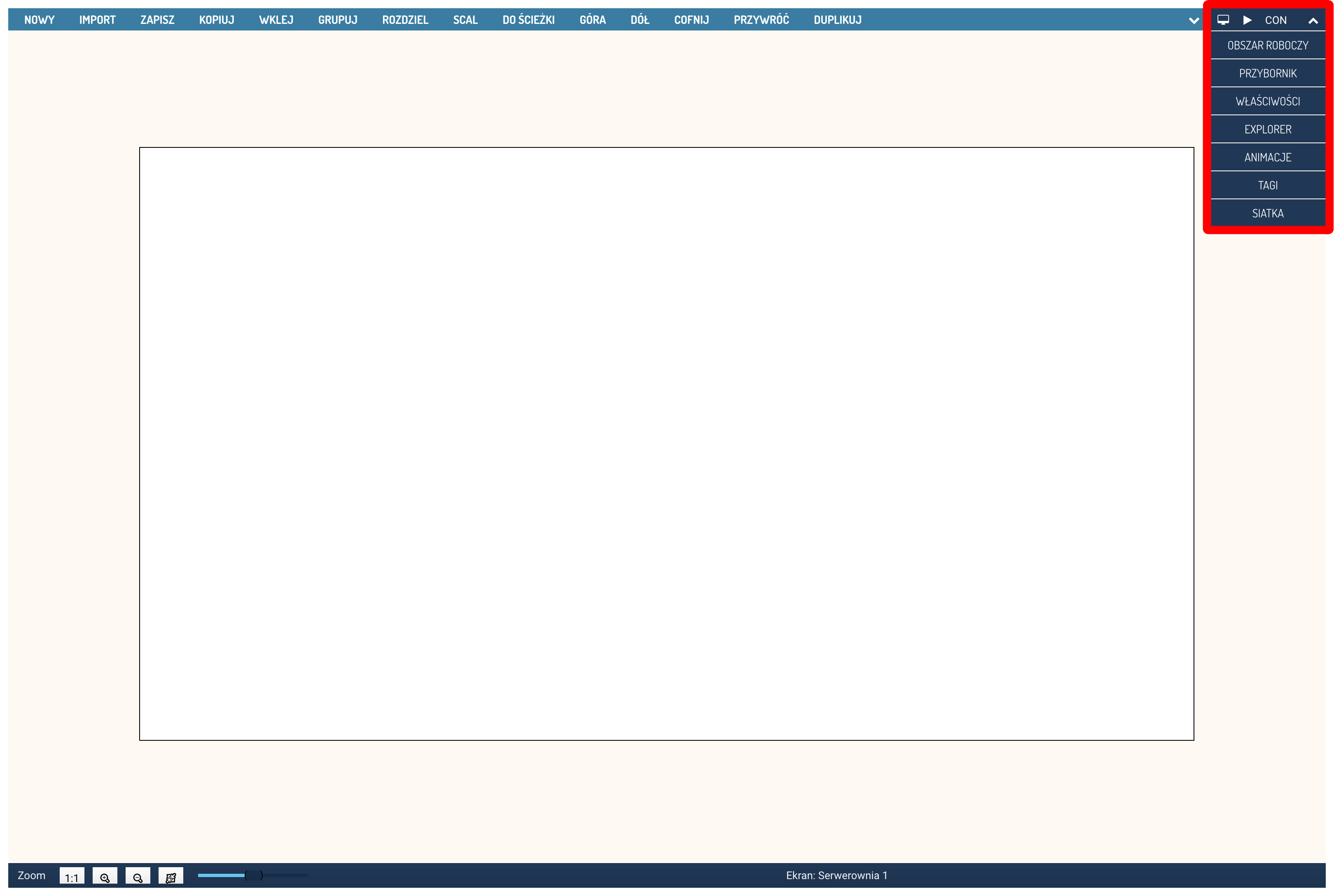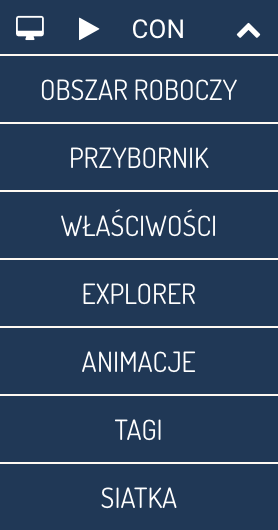 Po prawej stronie umieszczono menu, z którego można wyświetlać panele konfiguracyjne oraz narzędzia pozwalające zarządzać elementami znajdującymi się na ekranie:
