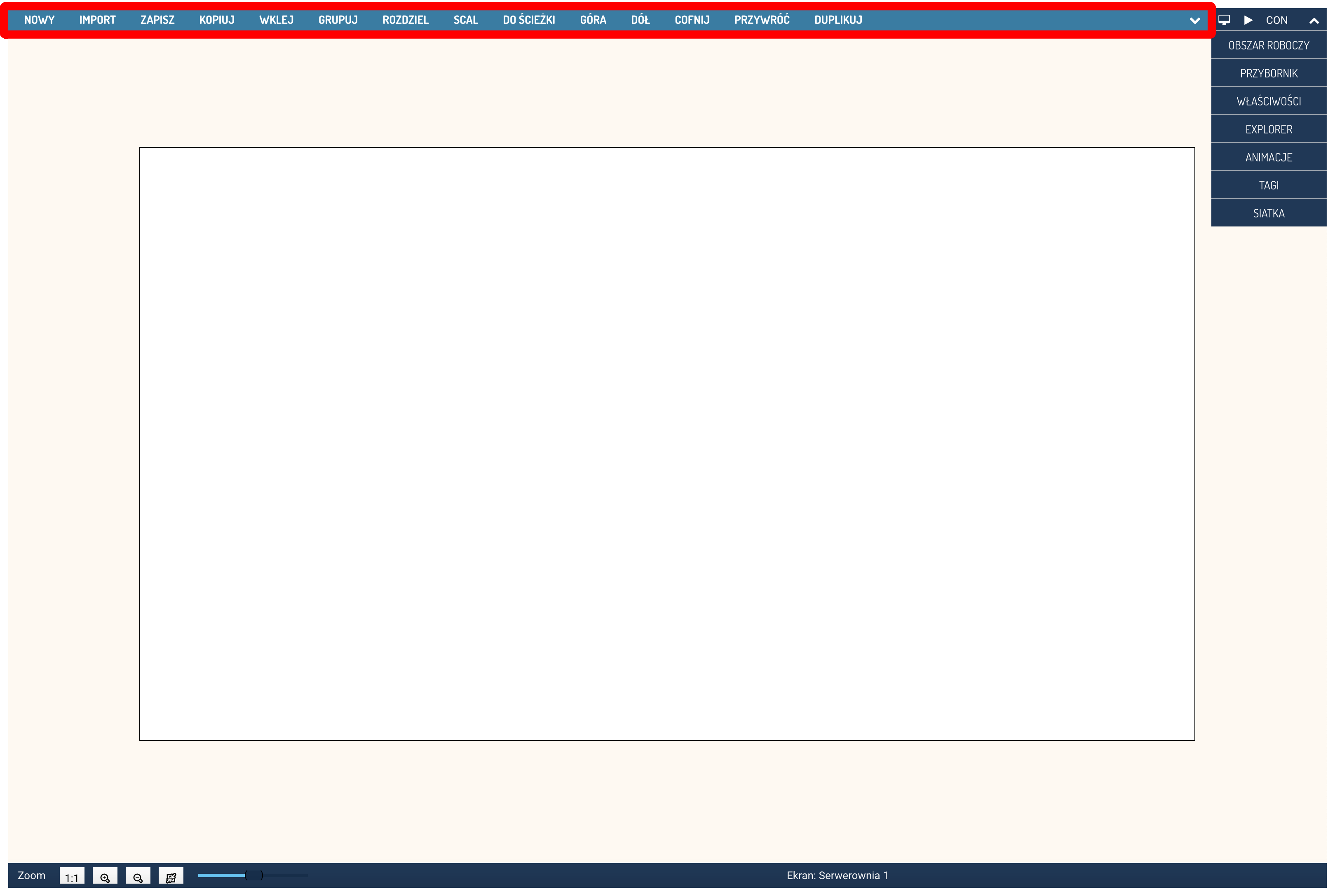 W górnej części ekranu znajduje się pasek narzędzi pozwalający wykonywać podstawowe operacje na projektowanym ekranie, takie jak: