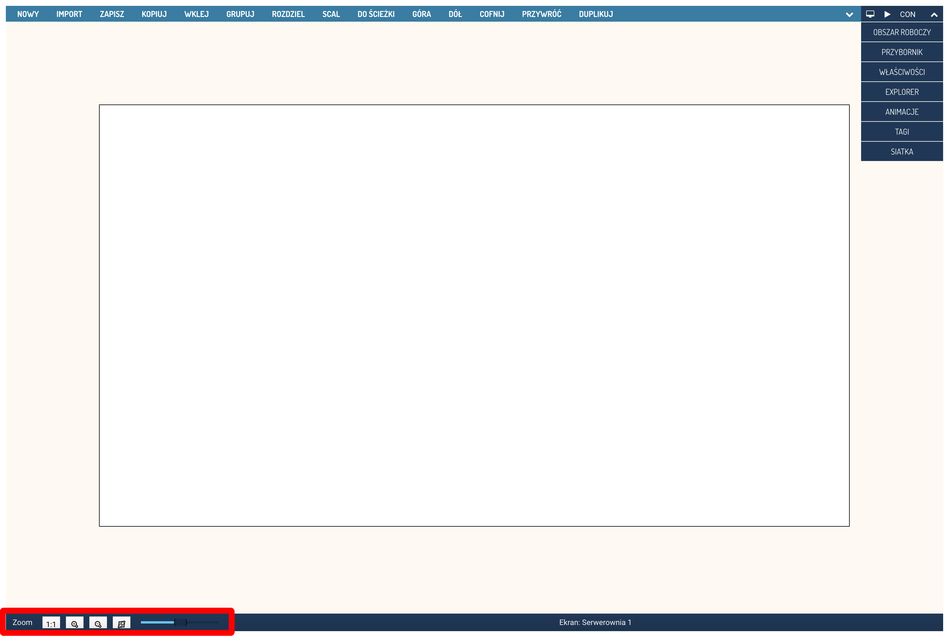 W lewym dolnym rogu znajdują się przyciski odpowiedzialne za zmianę powiększenia obszaru roboczego: