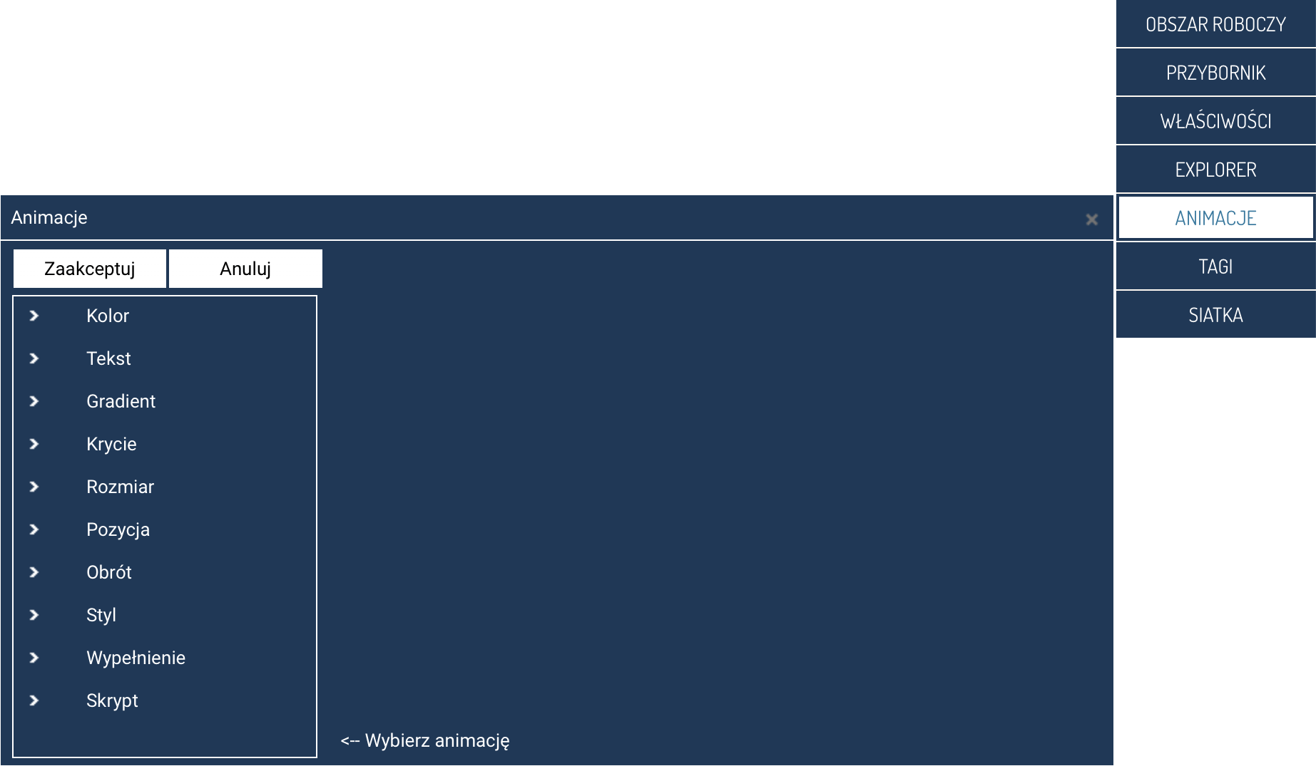 - Zaakceptuj – zapisuje wszystkie dodane lub zmodyfikowane animacje.