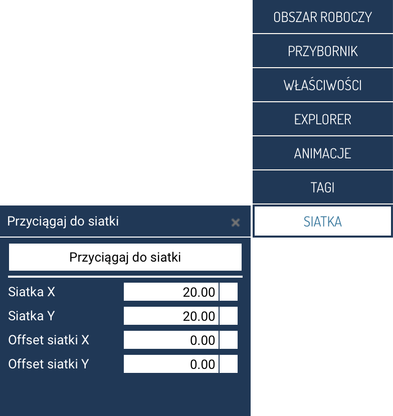 Panel Przyciągaj do siatki umożliwia precyzyjne rozmieszczanie elementów na ekranie poprzez wyrównywanie ich pozycji do zdefiniowanej siatki. Narzędzie pozwala zarówno włączyć automatyczne przyciąganie, jak i jednorazowo wyrównać wybrane obiekty.