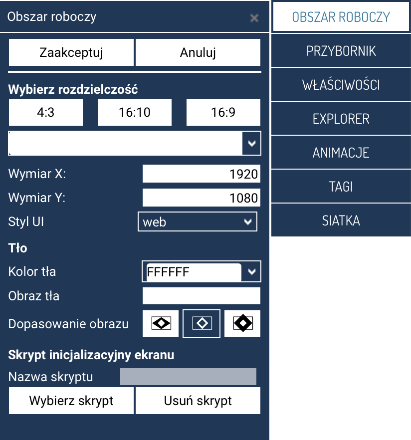 Panel Obszar roboczy służy do określania podstawowych parametrów ekranu SCADA przed rozpoczęciem jego projektowania. Umożliwia dobór rozdzielczości, ustawienie tła, stylu interfejsu oraz wybór skryptu inicjalizacyjnego.
